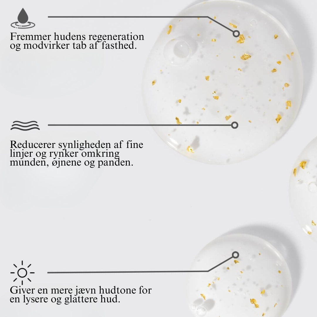 Det målretter effektivt fine linjer, lysner og fugter i dybden, hvilket giver din hud en strålende glød. Vores unikke blanding, som inkluderer 24K guld, niacinamid og hyaluronsyre, styrker hudens fugtbarriere og forbedrer hudens struktur generelt.